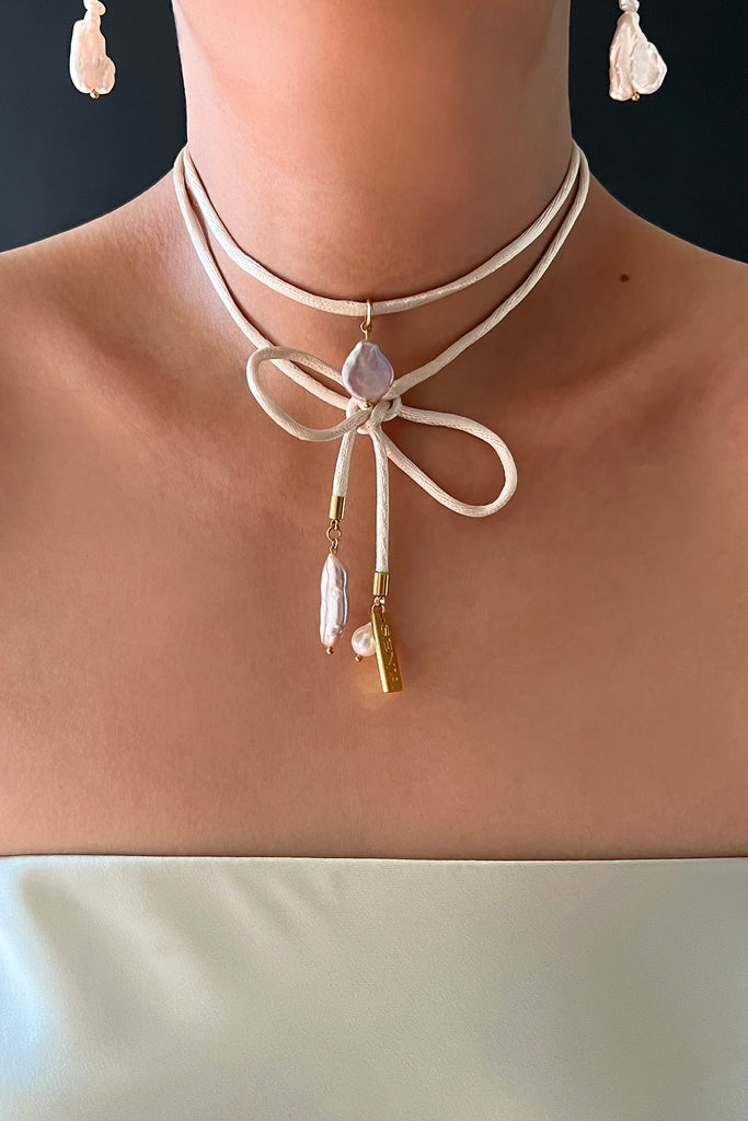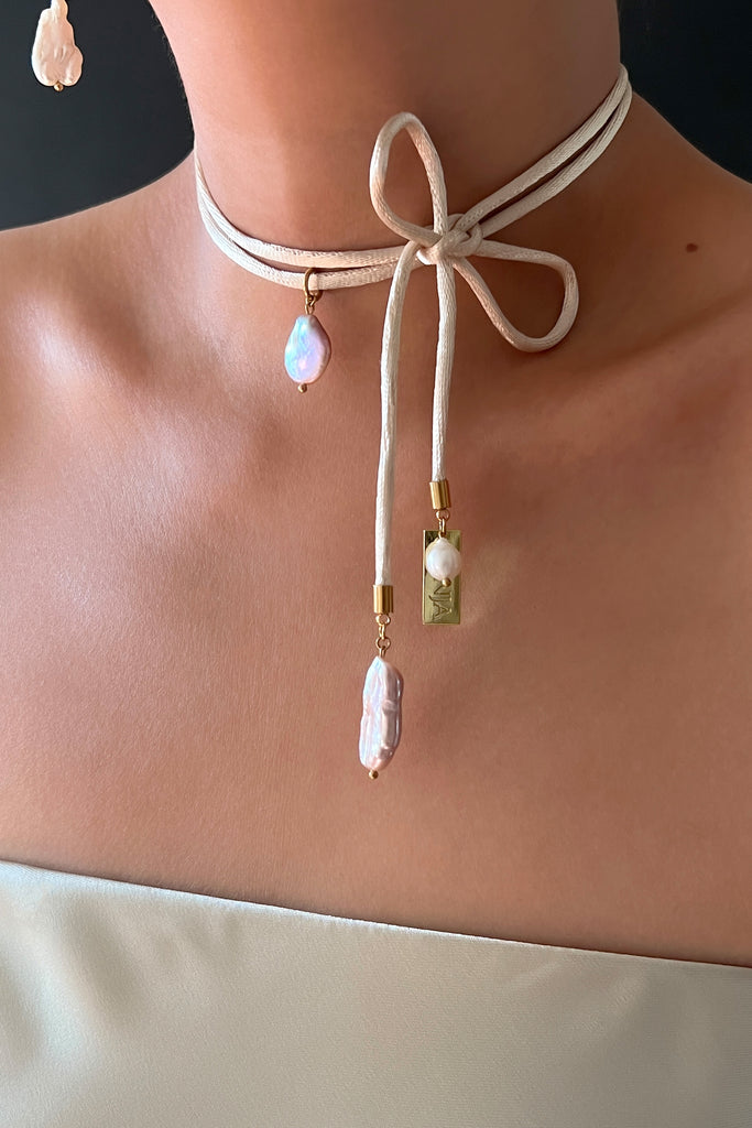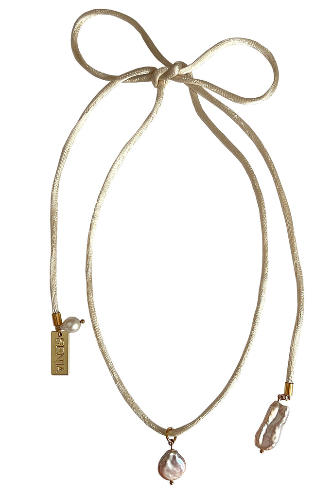 A modern update on the classic pearl necklace designed with organic shaped freshwater pearls suspended from a silky delicate cord. This necklace is great to wear on its own or a layering piece added to any other necklace in the collection.