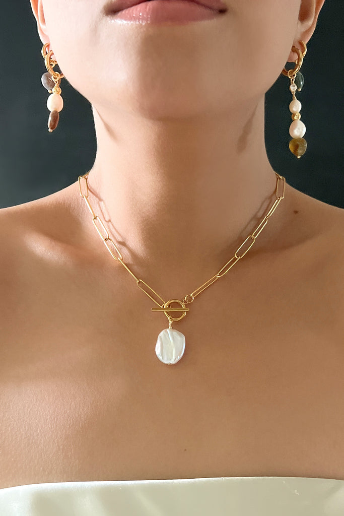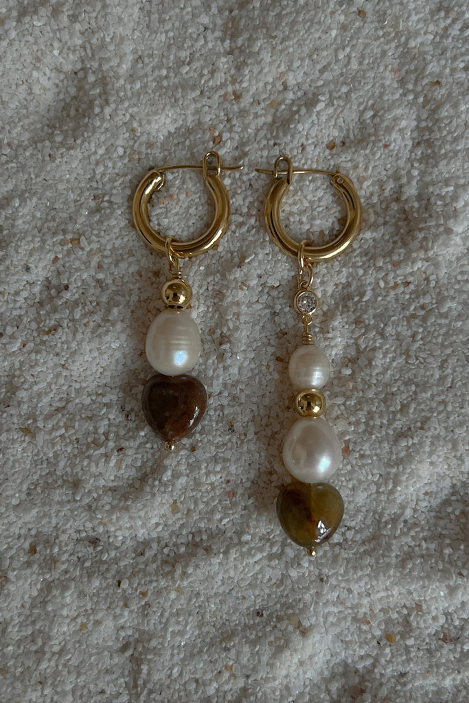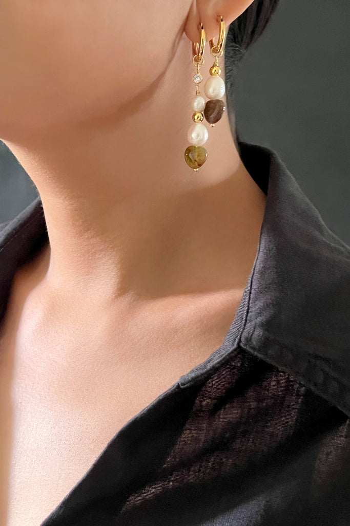 Mismatched hoops adorned with organic round-shaped freshwater pearls and heart gemstones that gracefully fall from gold hoops. A versatile option that can be worn with or without pearl adornment - slide the dangle off to wear just the simple hoop earring. The perfect choice for your next occasion.