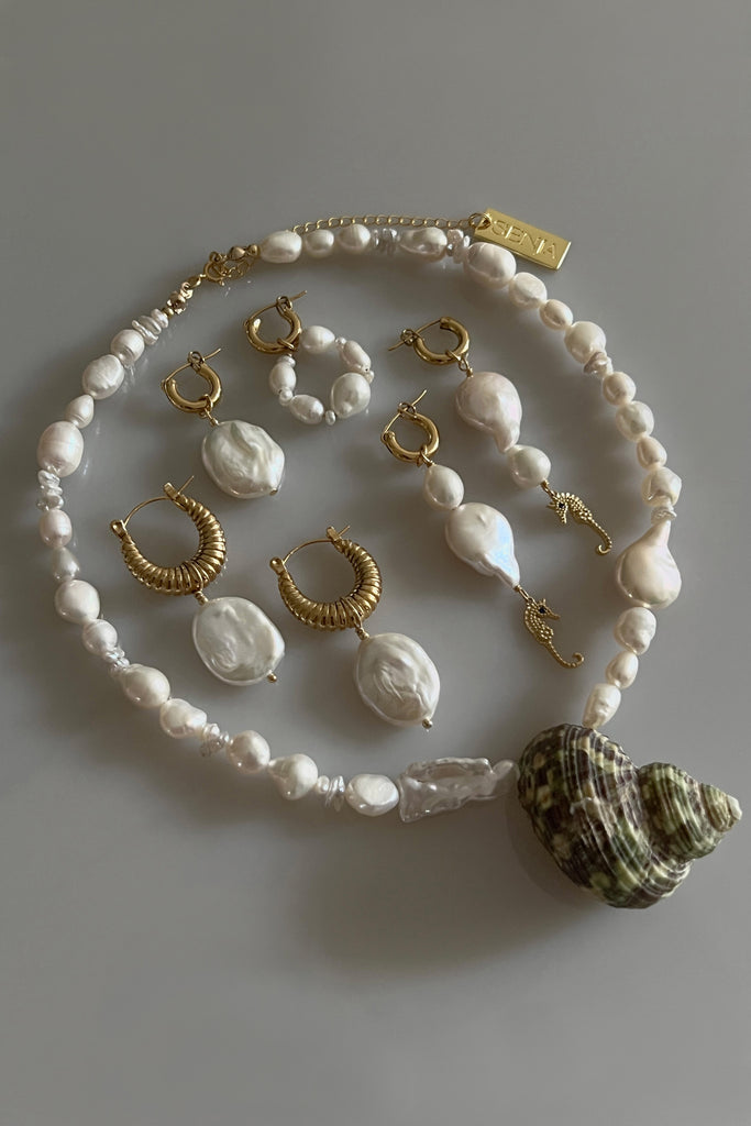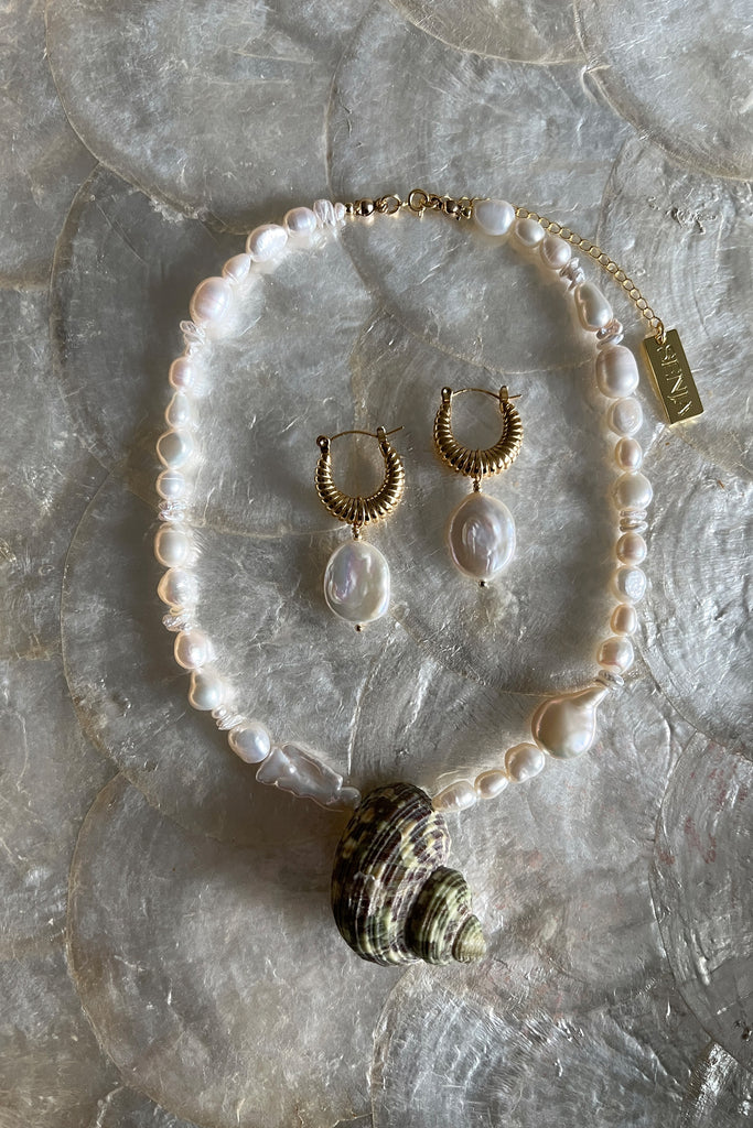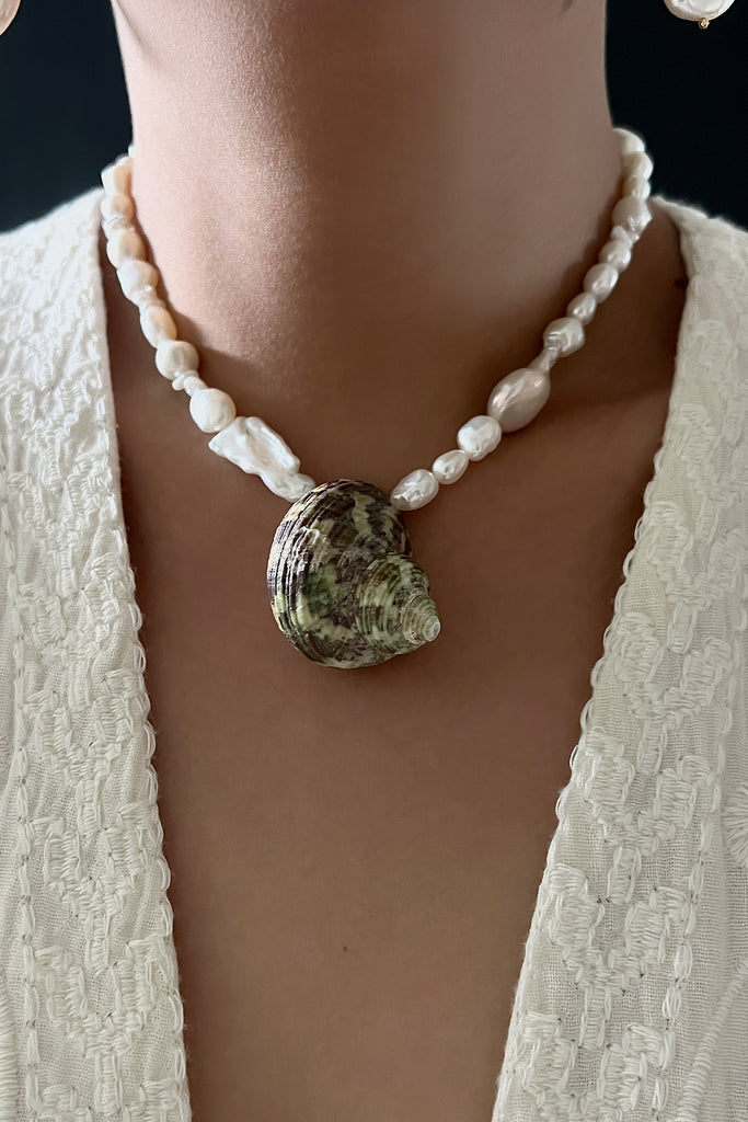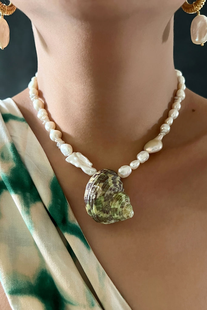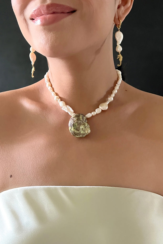 The Islander Seashell Necklace is a statement piece that captures the waves of the ocean and the perfect piece to elevate your next occasion look. Featuring a large shell pendant with organic-shaped freshwater pearls in all sizes, shapes and details. This style is a timeless heirloom sure to be cherished for years to come.