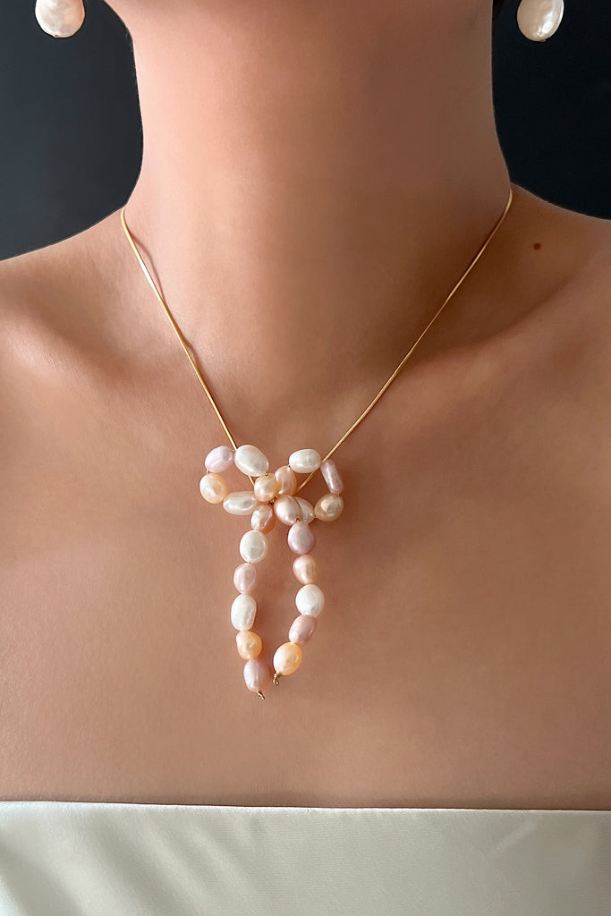 Not all pearl strands are white, and this stunning strand of multicolour freshwater pearls is an exquisite example. Featuring a ribbon pendant crafted from the soft pastel palettes found naturally in freshwater pearls with varying hues of pink and lavender, complementing and contrasting throughout the necklace. With its unique design, this necklace will add the perfect finishing touch to any outfit.