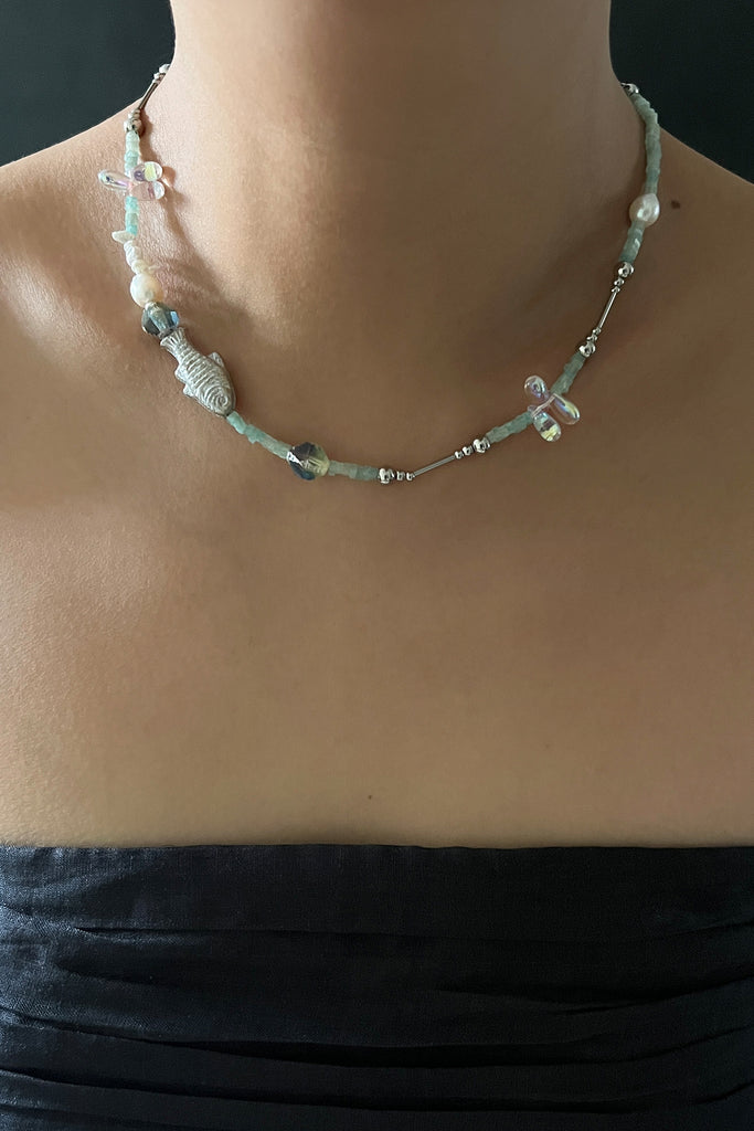 This playful necklace features natural amazonite beads in soft, calming hues of blue, accented with shimmering glass beads and delicate freshwater pearls. The design is enriched by intricate silver-toned details and a fish-shaped glass bead as the centerpiece, adding a whimsical, oceanic touch. The mix of textures and materials creates a unique piece that combines the soothing energy of amazonite with the lustrous beauty of pearls. Finished with a sleek toggle clasp, this necklace embodies both modern style and natural charm, perfect for adding a subtle statement to any outfit.