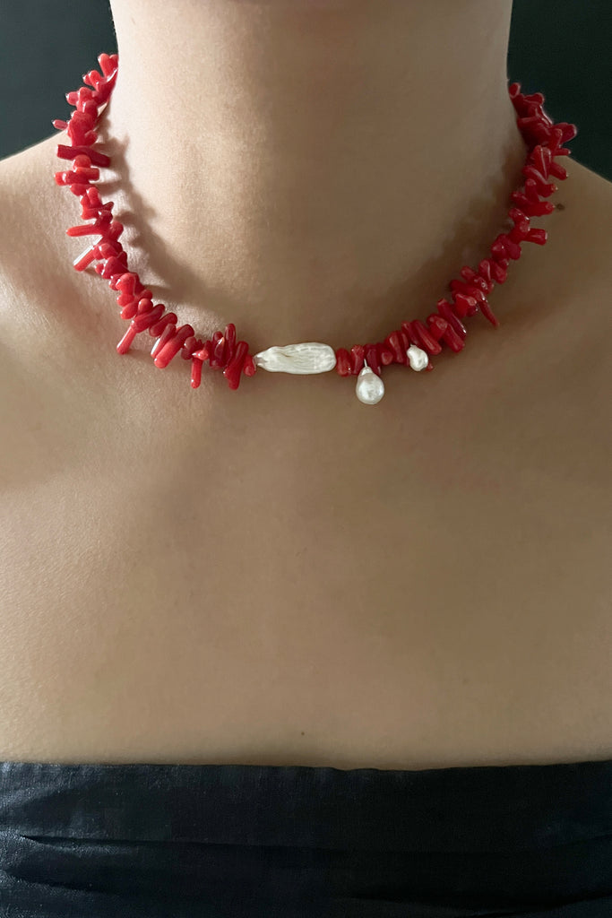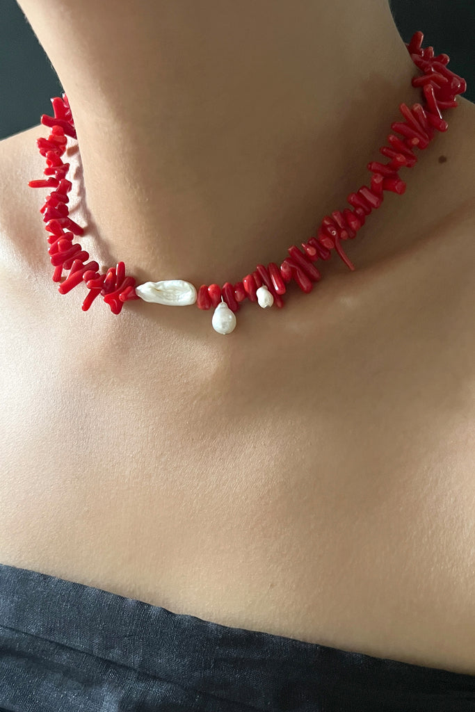 A statement of nature’s beauty, this necklace combines bold red coral with delicate freshwater pearls. The vivid coral brings vibrant energy, while the pearls add a touch of elegance, creating a striking balance between the rugged and refined.