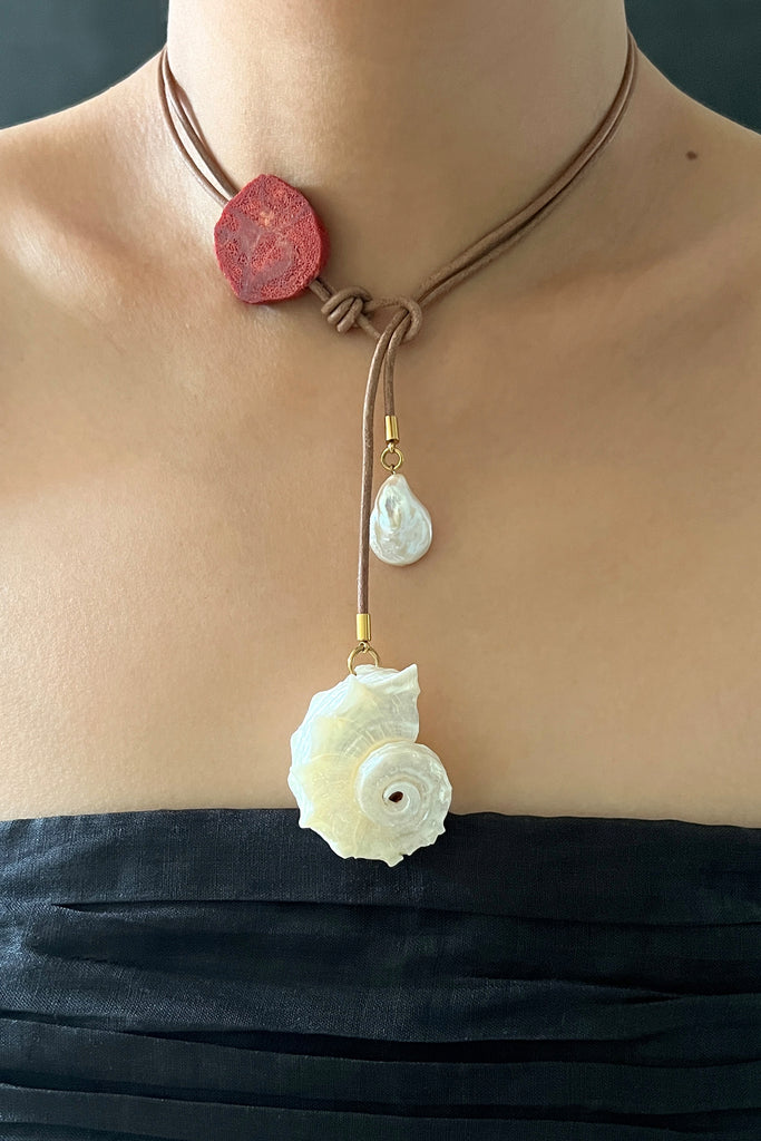 Embrace the beauty of nature with this handcrafted leather cord necklace. Featuring a vibrant red coral accent, a natural seashell pendant, and a lustrous freshwater pearl drop, this bohemian-inspired design captures the essence of coastal elegance. Perfect for beach lovers or anyone seeking a unique, earthy statement piece, this necklace is both lightweight and versatile. Adjustable leather cords ensure a comfortable fit, making it ideal for casual wear or special occasions.