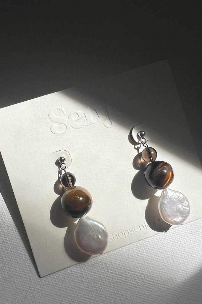 These Tiger's Eye, Smoky Quartz, and Freshwater Pearl Earrings feature an exquisite mix of textures and tones. The rich, warm hues of the tiger's eye beads create a striking contrast against the subtle, misty allure of smoky quartz. At the bottom, the freshwater pearls add a sophisticated touch with their organic shape and soft iridescence. Together, these elements evoke both natural elegance and timeless beauty, making these earrings a statement piece for any occasion, whether casual or formal.