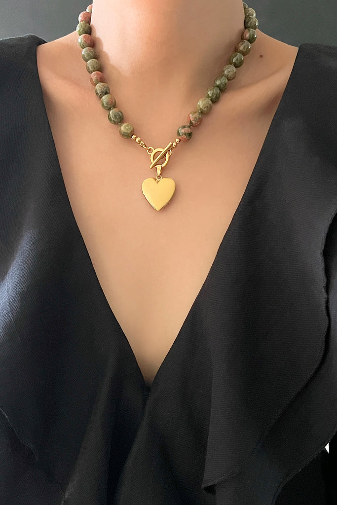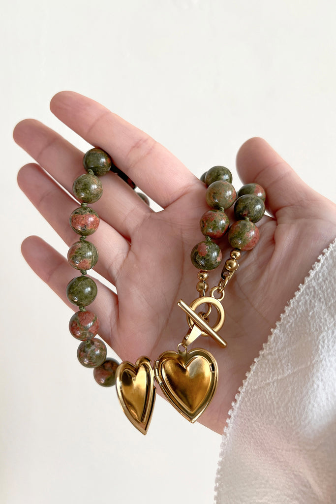 The necklace is accented with a gold-tone heart-shaped pendant that opens to reveal a hidden compartment, perfect for placing a small photo or keepsake inside. The necklace is secured with a stylish toggle clasp, adding a touch of vintage charm to this meaningful piece. A perfect combination of natural beauty and personal sentiment, it’s a stunning accessory with a special place for treasured memories.